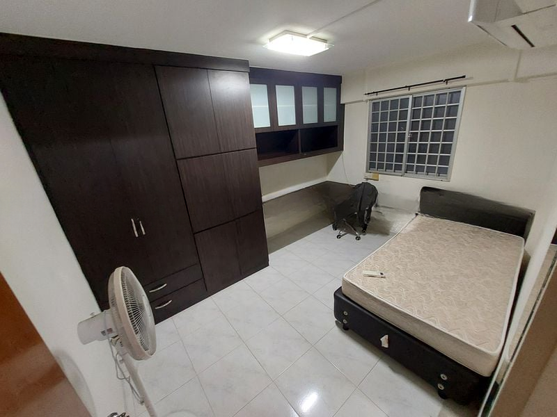 Step into this functional 2-bedroom HDB flat that greets you with a sense of practicality and comfort. The living room, adorned with tiled flooring and a sleek black leather sofa, is complemented by natural light filtering through the windows, creating a warm ambiance. Recessed wall niches add a touch of character, while the ceiling fan ensures a cool breeze throughout.