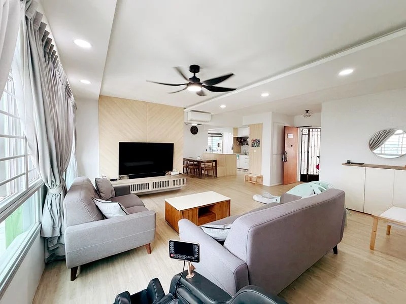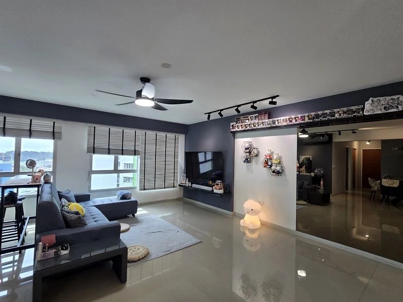Step into a world of modern elegance as you enter this beautifully renovated HDB flat. The abundant natural light floods the open-concept living area, accentuating the polished tile flooring and the striking dark blue accent wall. The large wall mirror enhances the sense of space, while track lighting adds a contemporary touch, creating an inviting ambiance that feels both spacious and cozy.