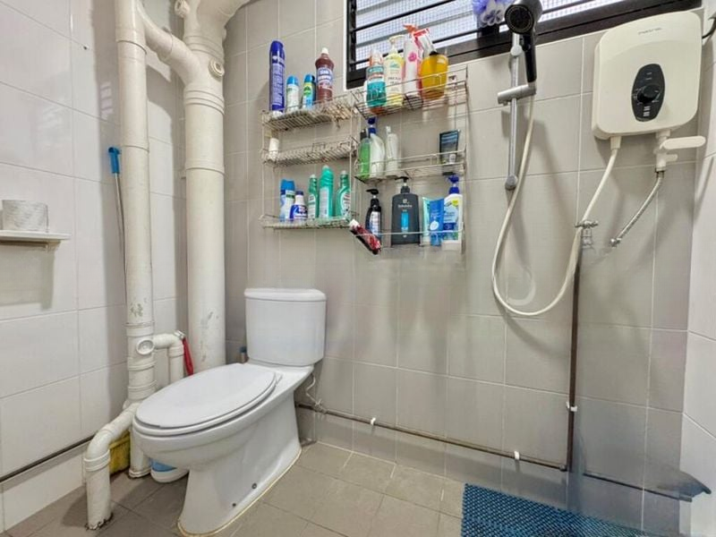Step into this inviting 4-room flat where natural light filters through large windows, creating a warm and welcoming ambiance. The functional layout features tiled flooring and a blend of modern and practical finishes, including brown leather sofas that add a touch of comfort to the living room. Enjoy the urban views that frame your everyday living experience.