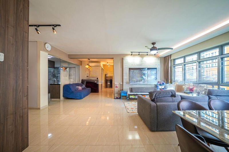 Step into a bright and airy sanctuary at 132 Edgedale Plains, where abundant natural light floods the spacious living area, highlighting the elegant tiled flooring and the inviting L-shaped leather sofa. The large windows frame picturesque views of lush greenery and nearby HDB blocks, creating a serene ambiance that instantly makes you feel at home.