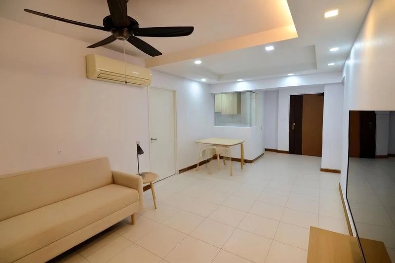 Step into this well-maintained 3-bedroom flat and feel the inviting ambiance created by the wood-look laminate flooring and ample natural light filtering through large windows. The urban residential views from the living room, adorned with blue curtains, enhance the sense of space and comfort, making it a perfect retreat after a long day.