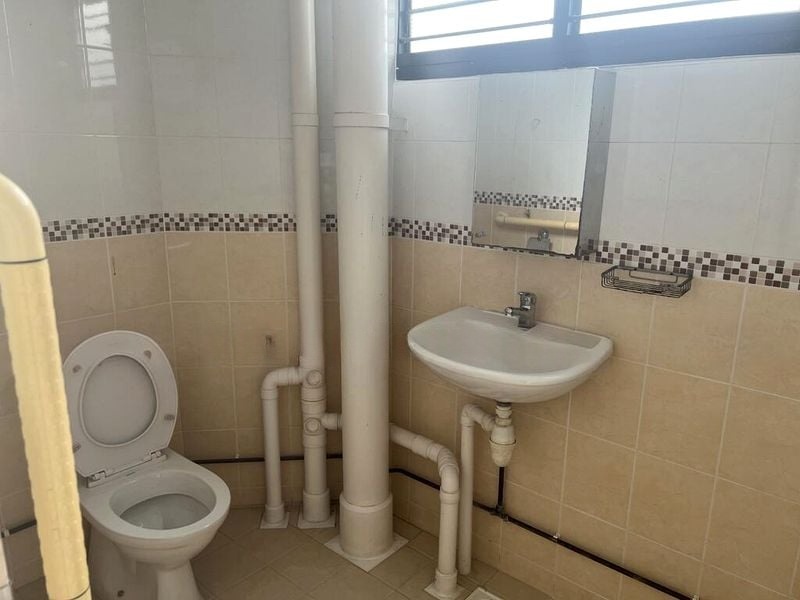 This well-maintained unit features three generous bedrooms, including a master suite with a built-in dark wood wardrobe. The kitchen is a standout with extensive cabinetry, a tiled backsplash, and a large window for optimal ventilation. The bathrooms are thoughtfully designed with modern finishes, including safety grab bars and an instant water heater for convenience.