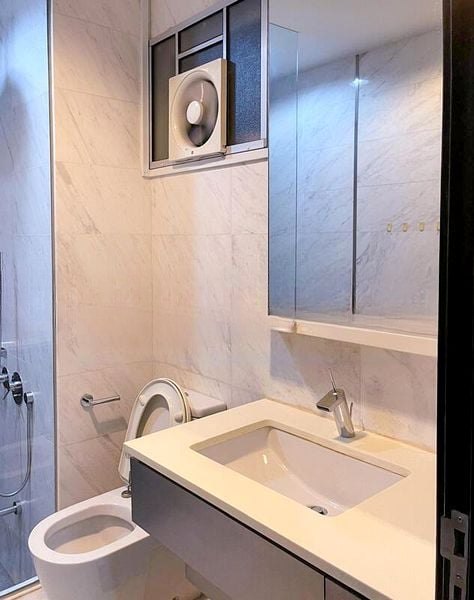 Step into this beautifully maintained 1-bedroom unit at EUHABITAT, where modern minimalist design meets comfort. The open-concept living area is bathed in natural light, showcasing a custom built-in TV console with glass shelving and a cozy blue fabric sofa, perfect for relaxation. Enjoy serene views of greenery and neighboring buildings from the glass-railed balcony, enhancing the tranquil ambiance of your home.