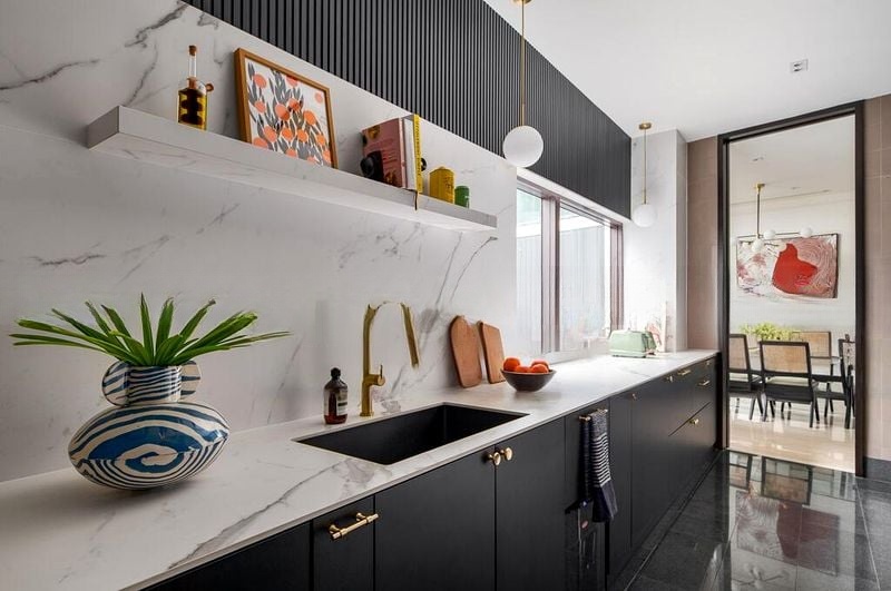 Step into a realm of modern luxury where abundant natural light dances through floor-to-ceiling windows, illuminating the exquisite white marble countertops and the elegant wood-paneled feature walls. The ambiance is both inviting and sophisticated, with a striking gold-leaf arched niche adorned with a bamboo motif, creating a serene focal point that captivates the senses.