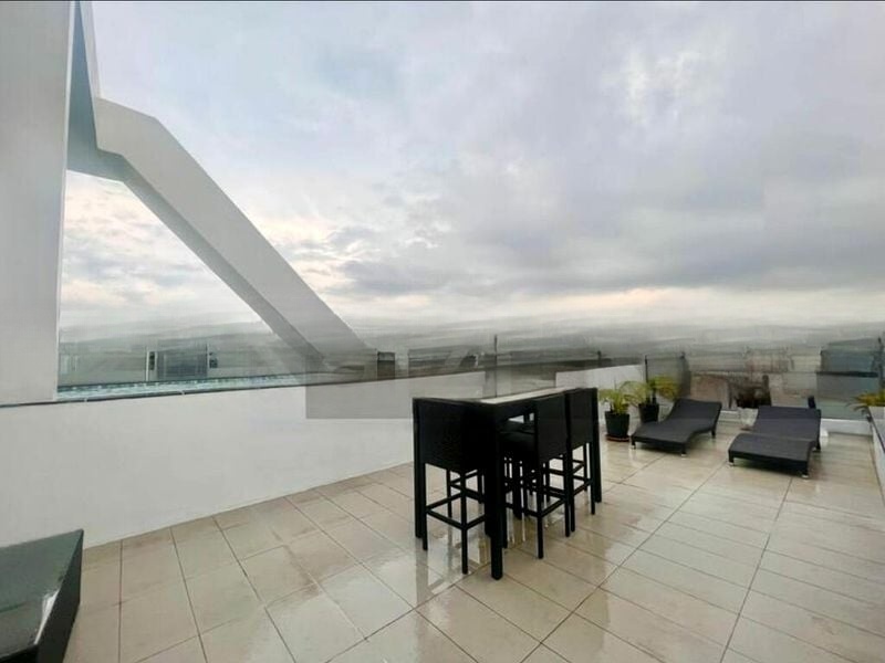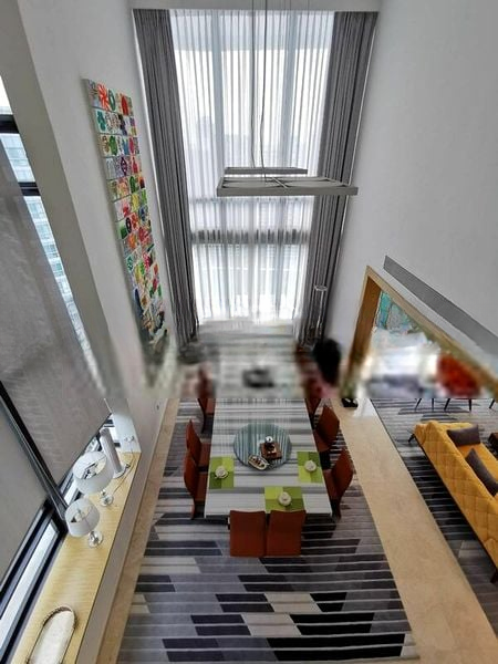 Step into a world of modern elegance as you enter this exquisite unit at TRILIGHT. Bathed in abundant natural light, the open-concept living space features high ceilings and floor-to-ceiling windows that frame breathtaking views of the city skyline and the rooftop pool. The minimalist design, complemented by a glass staircase and designer furnishings, creates an inviting ambiance perfect for relaxation and entertaining.
