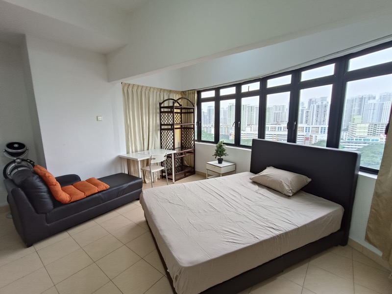 This well-maintained unit features a cozy bedroom with a spacious mirrored wardrobe and a study desk, perfect for work or relaxation. The bathroom boasts a luxurious bathtub, complemented by stylish white wall tiles and a practical medicine cabinet. The layout maximizes space, ensuring comfort and functionality in every corner.