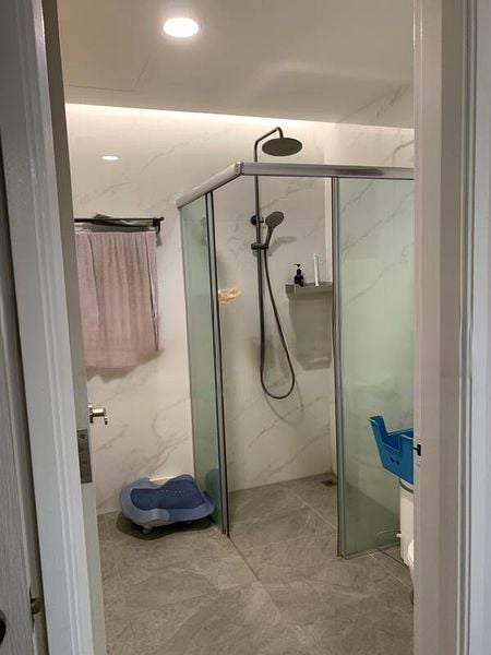 Step into a bright and airy sanctuary at The Rivervale, where abundant natural light floods the spacious living area, accentuating the polished tile flooring and creating an inviting ambiance. The large floor-to-ceiling wall mirror in the dining area enhances the sense of space, while the urban and residential views from the windows provide a picturesque backdrop to your daily life.