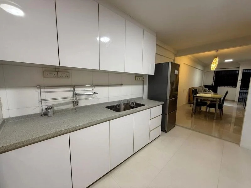Step into this well-maintained HDB flat and be greeted by a bright and inviting living space, where the open layout seamlessly connects the living and dining areas. The modern pendant lighting in the dining room casts a warm glow over the tiled flooring, while the large leather sofa offers a comfortable spot to unwind. Natural light filters through the windows, enhancing the simple yet functional ambiance of the home.