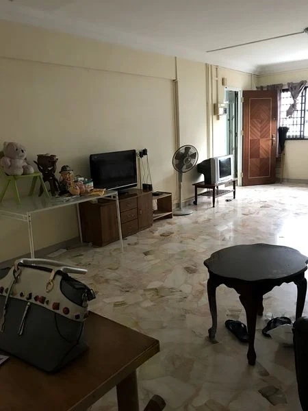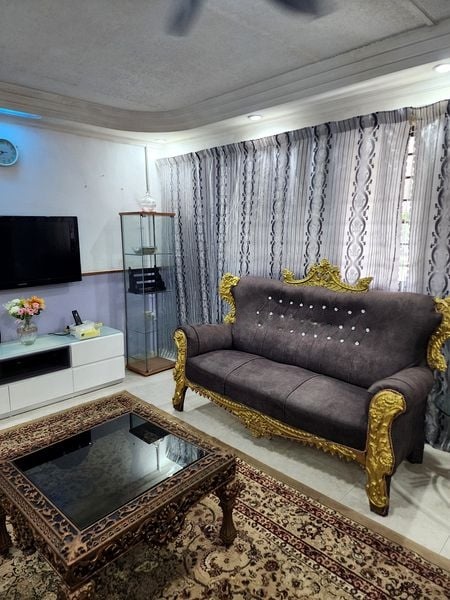 This spacious 3-bedroom flat features an open-concept layout that seamlessly connects the living, dining, and kitchen areas. The large L-shaped sofa in the living room provides ample seating, while the dining area boasts a dark wood 6-seater set, ideal for family gatherings. The kitchen is equipped with a large side-by-side refrigerator and grey wood-grain cabinetry, ensuring both functionality and style.