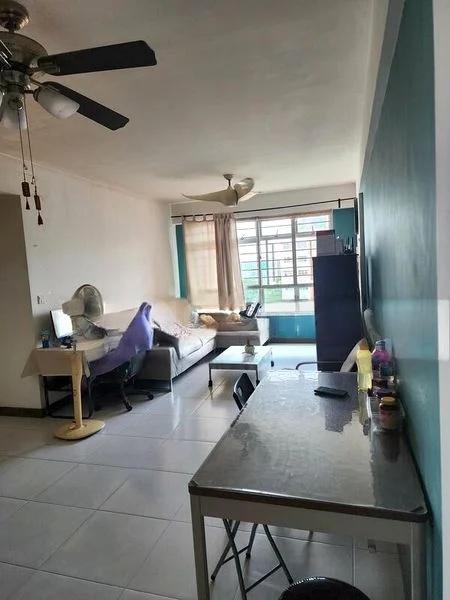 Step into this well-maintained 3-bedroom flat and be greeted by a warm, lived-in ambiance that invites you to unwind. The dual ceiling fans in the living room enhance the space's comfort, while large windows allow natural light to filter in, offering a glimpse of the vibrant urban landscape outside. The vibrant green kitchen cabinetry adds a unique touch, making the heart of the home truly stand out.