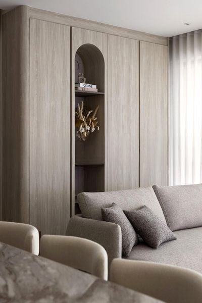 This thoughtfully laid-out unit boasts a seamless blend of style and functionality. The spacious dining room, highlighted by a marble dining table and custom wavy arched niche, is perfect for entertaining. The en-suite master suite offers a private retreat, complemented by a separate wet and dry kitchen layout that caters to culinary enthusiasts. With a dedicated utility/store room and a balcony for outdoor enjoyment, this home is designed for modern living.