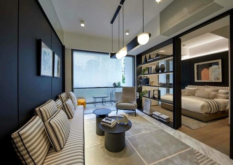 Step into a world of modern luxury as you enter this brand-new 2-bedroom unit at The Landmark. Bathed in abundant natural light, the floor-to-ceiling glass walls offer breathtaking panoramic views of the city skyline, lush greenery, and the iconic Marina Bay. The designer finishes, including recessed ceiling lighting and a striking striped sofa, create an inviting ambiance that feels both sophisticated and comfortable.