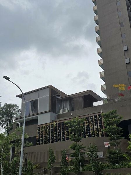 This thoughtfully designed unit features a spacious living room that seamlessly flows into a glass-enclosed dining area, perfect for entertaining while enjoying the stunning vistas. The bedroom boasts a stylish glass partition wall and integrated shelving, providing both privacy and functionality. Every corner of this home is accentuated by designer lighting fixtures and lush vertical greenery, enhancing the overall aesthetic.