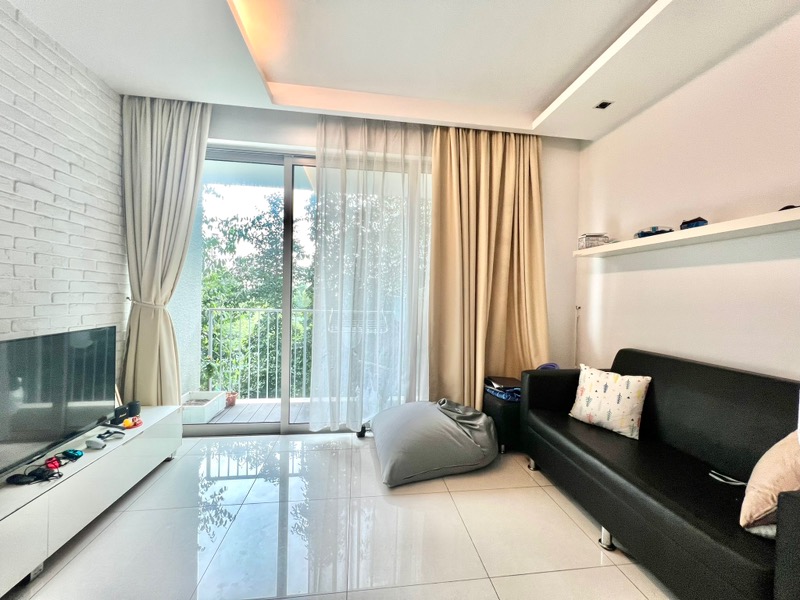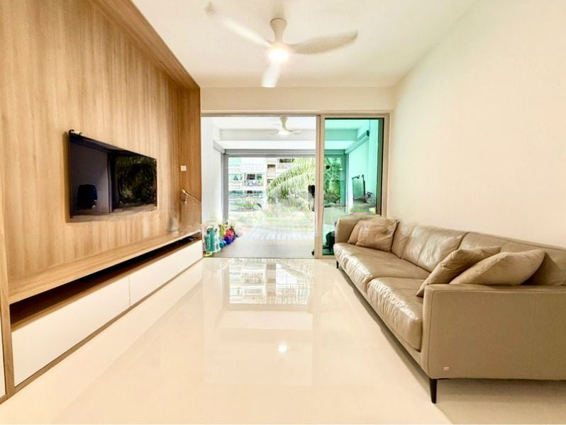 Step into a world of modern elegance as you enter this beautifully renovated unit at Caspian. The abundant natural light floods the open living space, highlighting the polished floor tiles and the custom wood-paneled TV feature wall. Enjoy serene views of the pool and lush greenery from your balcony study nook, creating a tranquil ambiance that invites relaxation.