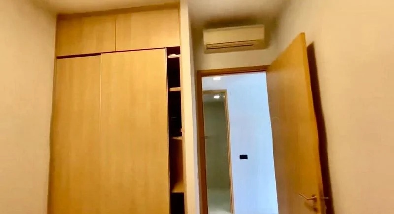 The heart of this home is the stylish kitchen, featuring minimalist white cabinetry and a striking island with a dark wood base. Equipped with an integrated microwave and built-in oven, along with a sleek black cooktop and glass backsplash, this space is both functional and visually appealing. The two spacious bedrooms come with built-in wooden wardrobes and wall-mounted air-conditioning units, ensuring comfort and convenience.