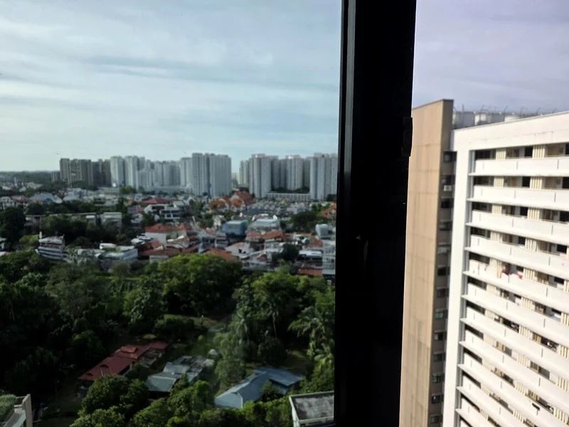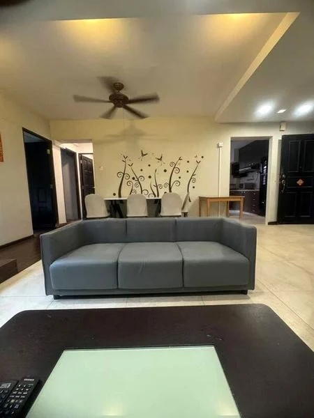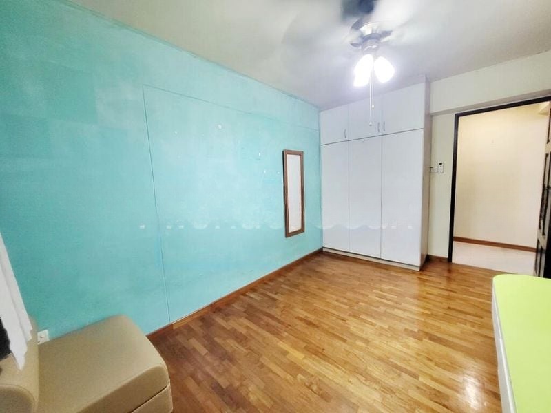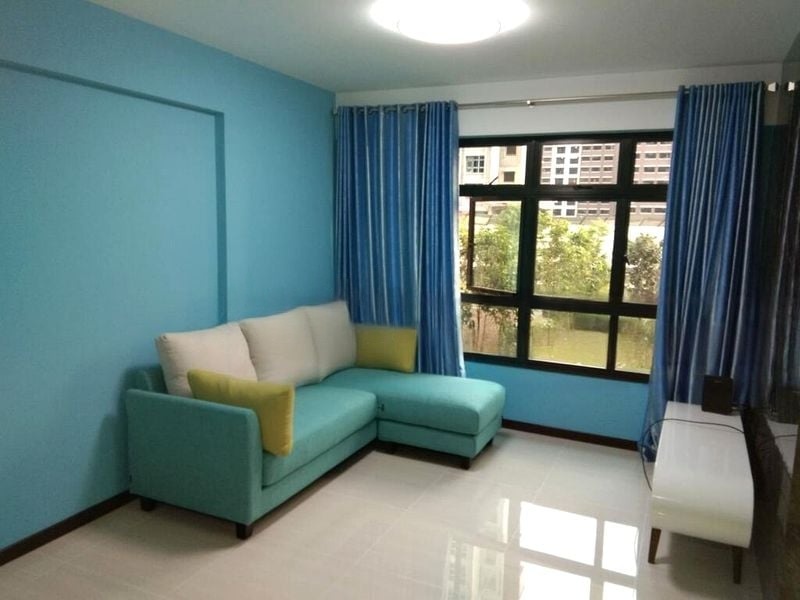 Step into a world of vibrancy and light in this beautifully renovated HDB flat at 996C Buangkok Cres. The moment you enter, you are greeted by an abundance of natural light that dances across the bold teal and blue accent walls, creating a cheerful ambiance. The modern pendant lighting and vibrant blue kitchen cabinetry add a contemporary flair, while views of lush greenery and neighboring buildings enhance the serene atmosphere.