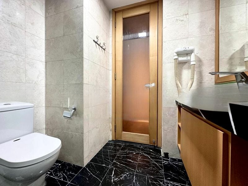 This well-designed unit features a spacious layout with three comfortable bedrooms, each adorned with wood flooring and built-in wardrobes. The master bathroom boasts a floating vanity with a sleek black countertop, complemented by a glass shower enclosure and modern finishes. The communal areas include a large swimming pool surrounded by landscaped courtyards, perfect for relaxation and leisure.