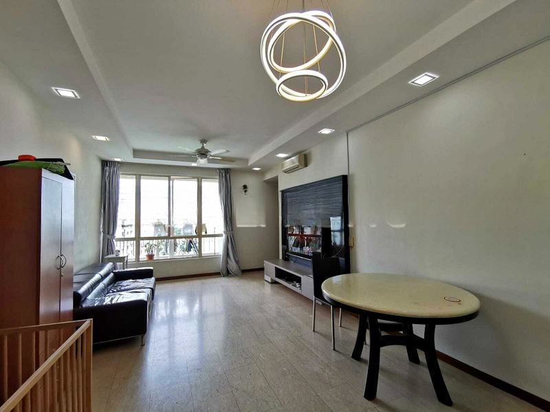 Step into this beautifully renovated 4-bedroom unit at Yishun Emerald and be greeted by an abundance of natural light that fills the spacious living area. The bright ambiance is complemented by large windows and a modern TV console, creating an inviting atmosphere perfect for relaxation and entertainment.