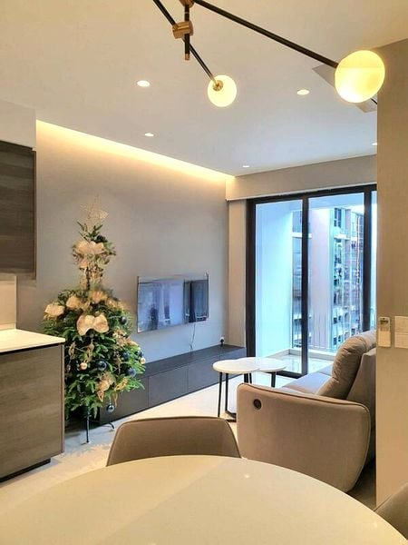 Step into a warm and inviting atmosphere where abundant natural light floods through the floor-to-ceiling windows, illuminating the open-concept living and dining area. The cozy ambiance is complemented by tiled flooring and sheer curtains, creating a perfect space for relaxation and family gatherings. Enjoy picturesque views of lush greenery and urban buildings, making every moment spent here feel special.