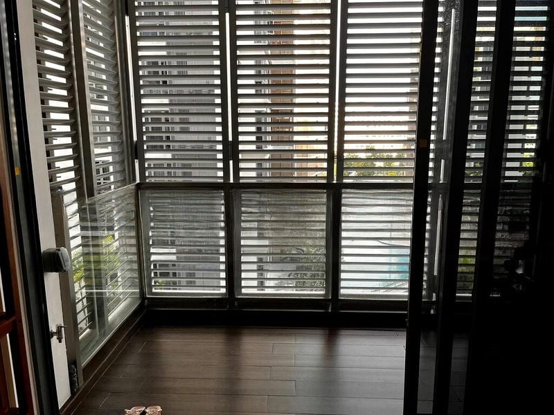 This well-maintained unit features a compact yet efficient layout, including a master en-suite bedroom with zebra blinds that frame the picturesque pool view. The bathroom is elegantly finished with grey marble-patterned wall tiles and a convenient built-in toiletry ledge. A separate study area provides the perfect nook for work or relaxation, enhancing the functionality of this charming home.