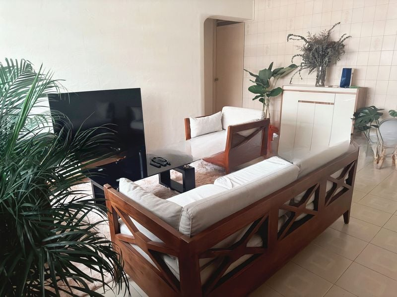 Step into this inviting corridor end unit and feel the warmth of a cozy ambiance, enhanced by natural light filtering through louvered windows. The well-maintained interiors feature a harmonious blend of wooden finishes and modern touches, with a standout hanging egg chair and a stylish wooden sofa set that beckons relaxation.