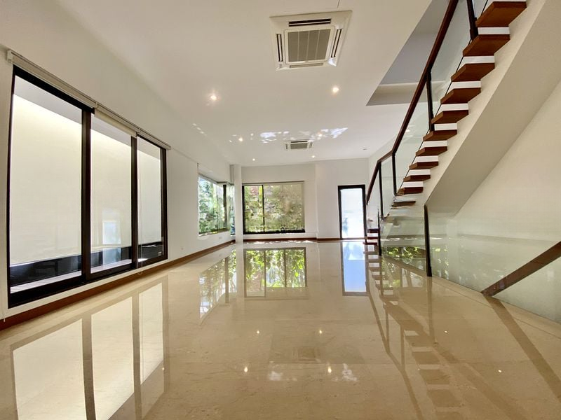Step into a world of elegance as you enter this beautifully renovated 5-bedroom home at Lornie 18. The bright and airy ambiance is accentuated by abundant natural light streaming through the floor-to-ceiling glass windows, offering serene views of lush greenery. Polished marble flooring invites you into the open-concept living and dining area, while the glass staircase railings add a touch of modern sophistication.