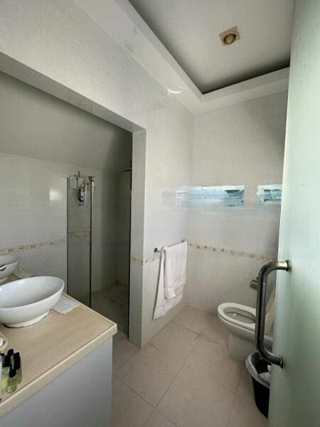 This spacious 6-bedroom unit features a thoughtful layout, including a stylish kitchen with a breakfast bar and pendant lighting, ideal for casual dining. The living room boasts an L-shaped leather sofa and a ceiling fan, while the bathrooms are adorned with vessel sinks and walk-in showers, showcasing meticulous attention to detail. The outdoor area complements the indoor space, offering a tiled balcony with potted plants and comfortable seating.