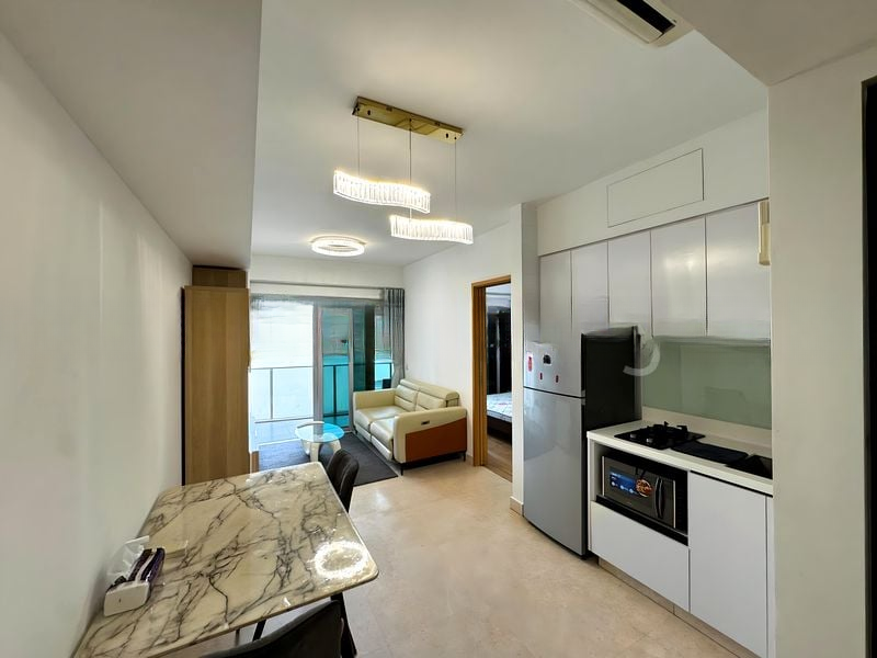 Step into a sanctuary of modern elegance at EIGHT RIVERSUITES, where abundant natural light floods the open-concept living area, accentuating the sleek finishes and minimalist design. The stunning views of urban greenery create a serene backdrop, while the designer pendant lighting and marble-patterned dining table add a touch of sophistication to your dining experience.