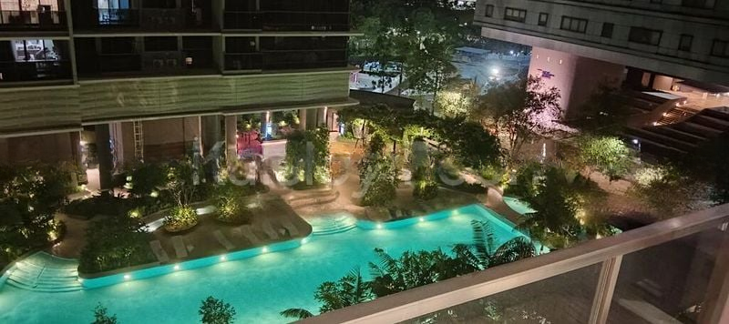 Step into this inviting unit at ONE-NORTH RESIDENCES, where you are greeted by a warm ambiance and a delightful view of the swimming pool and landscaped gardens. The open concept design floods the space with natural light, creating a cozy yet functional atmosphere. The living area features wood-look flooring and stylish track lighting, complemented by a comfortable blue fabric sofa, making it the perfect spot to unwind.