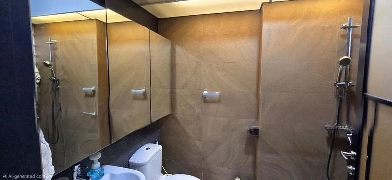 This well-maintained unit features an efficient layout with three spacious bedrooms, including a luxurious walk-in wardrobe equipped with integrated LED lighting. The living room boasts a stylish marble-patterned feature wall and an integrated TV console, complemented by wood-look laminate flooring. The bathrooms are designed for comfort, featuring large mirrored cabinets, textured wall tiles, and a refreshing rain shower, perfect for unwinding after a long day.