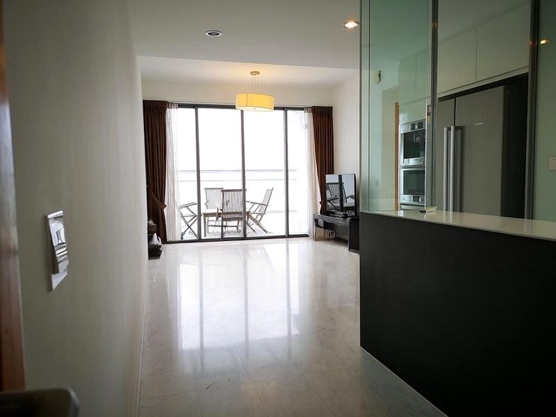This well-maintained 3-bedroom, 2-bathroom unit boasts standout features including a modern kitchen equipped with integrated Bosch appliances and a built-in wine chiller. The master bedroom offers a serene retreat with wood parquet flooring and direct access to the balcony, while the bathrooms are designed for luxury with rain showers and marble-effect wall tiles. The thoughtful layout ensures comfort and style in every corner.