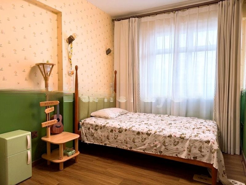 Step into a world of elegance as you enter this beautifully renovated HDB flat, where abundant natural light floods the space, creating a bright and airy ambiance. The marble-look floor tiles and the striking antler-style chandelier set a sophisticated tone, while the glass-enclosed study area offers a perfect blend of functionality and style, complemented by urban views of neighboring buildings.