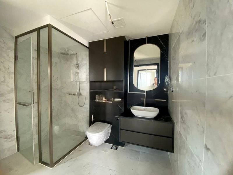 This thoughtfully designed 2-bedroom unit features an open layout that seamlessly connects the living room and island kitchen, perfect for entertaining. The modern kitchen boasts dark cabinetry, an induction hob, and integrated appliances, complemented by under-cabinet lighting that enhances its contemporary feel. The bathroom is a luxurious retreat, featuring a rain shower, wall-hung toilet, and vessel sink, all adorned with marble-look wall tiles.