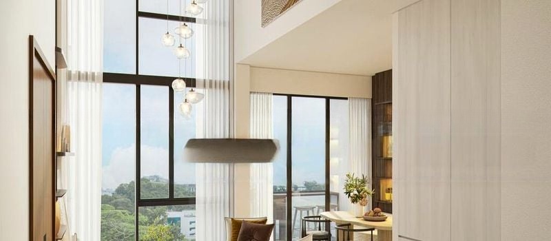 This thoughtfully designed 2-bedroom, 2-bathroom unit features a bright and open layout, perfect for contemporary living. The dining room boasts a striking modern linear chandelier and a wood-paneled feature wall, while the living room is enhanced by designer cluster pendant lights and large format windows. Step outside to your private terrace, where panoramic views await, complemented by a ceiling fan for those warm Singapore evenings.