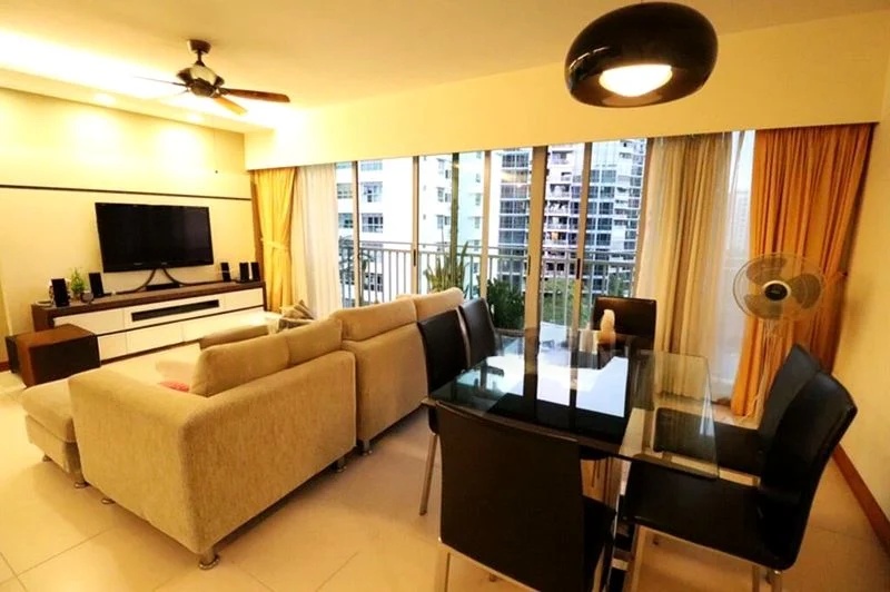 This well-maintained unit features three comfortable bedrooms, including a master bedroom with built-in floor-to-ceiling wardrobes and an integrated TV console. The living area is thoughtfully designed with an L-shaped sofa, while the dining space boasts a modern glass-top table, ideal for family gatherings. Enjoy the convenience of a fully-furnished home that combines style with functionality.