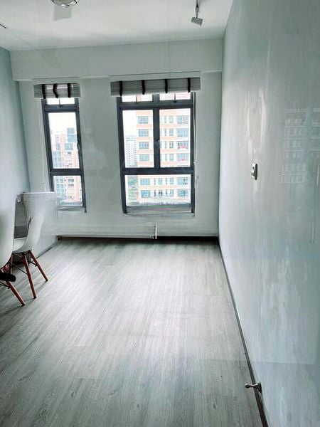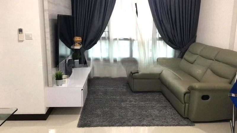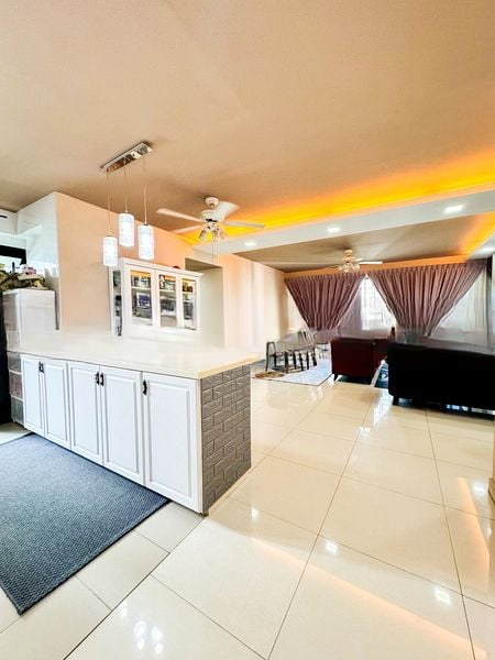 This thoughtfully renovated 3-bedroom flat features an L-shaped kitchen adorned with dual-tone cabinetry and stainless steel appliances, perfect for culinary enthusiasts. The bedrooms are fitted with parquet flooring and plush furnishings, including a large orange padded headboard that adds a touch of warmth. A dedicated study with wooden bookshelves provides an ideal workspace, ensuring functionality without compromising style.