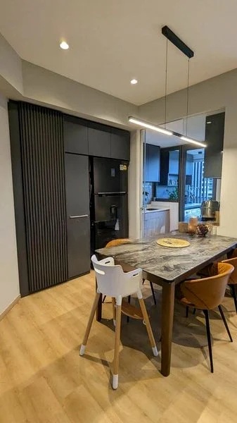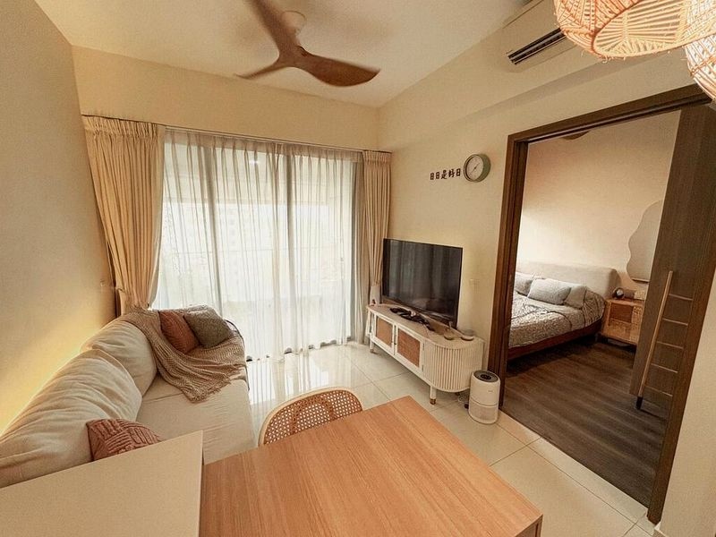 Step into a serene oasis where modern minimalist design meets urban living. This well-maintained 1-bedroom unit at Riverbank @ Fernvale welcomes you with its inviting ambiance, featuring large windows that frame stunning city skyline views and allow natural light to gently illuminate the space. The sleek finishes, including white quartz countertops and dark wood-look flooring, create a harmonious balance that feels both stylish and comfortable.