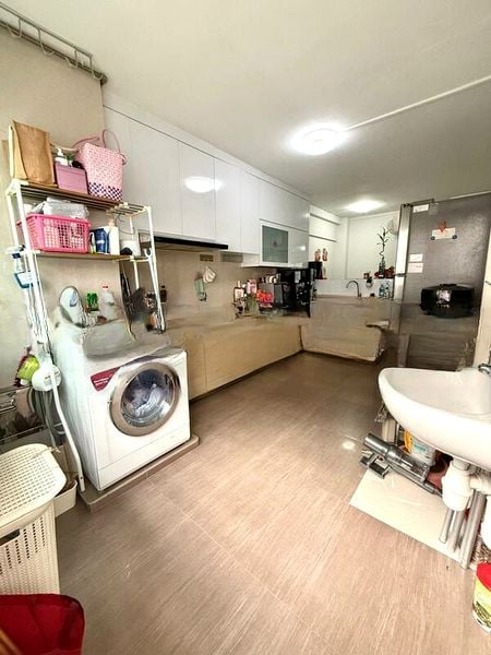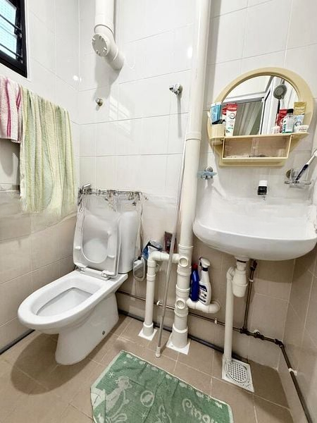 Step into a functional and lived-in space where classic terrazzo flooring greets you, creating a warm and inviting ambiance. The living room boasts a spacious layout, complemented by natural light filtering through the windows, offering views of neighboring greenery and HDB blocks. A dedicated study desk area ensures productivity while you enjoy the comfort of your home.