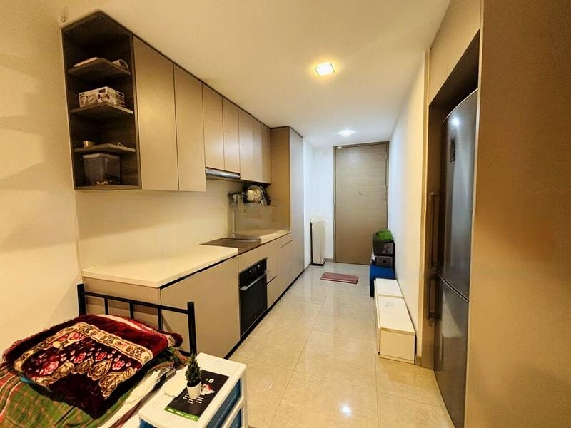 This well-maintained 2-bedroom unit features a spacious living area with a maroon reclining sofa, perfect for relaxation. The dining/bar area boasts a stylish wooden bar counter, complemented by blue velvet bar stools, making it ideal for entertaining. With custom built-in storage cabinetry and a neutral color palette throughout, the layout maximizes both functionality and aesthetic appeal.