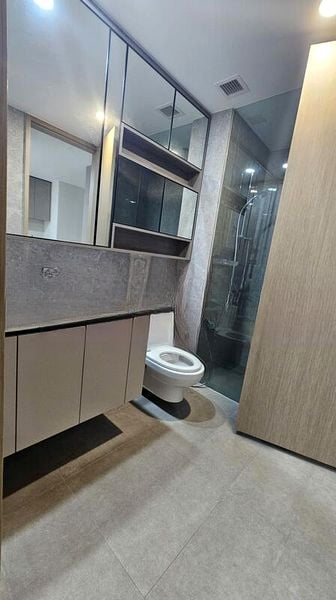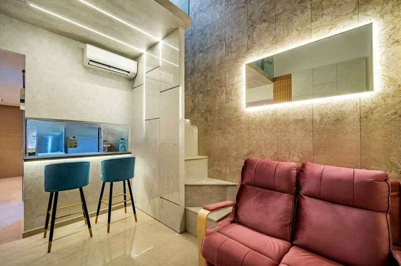 Step into a world of modern elegance as you enter this beautifully designed unit at The Tapestry. The sleek finishes, highlighted by linear LED ceiling lighting and a stunning backlit wall mirror, create an inviting ambiance. The textured stone-look feature wall and plush velvet bar stools with gold accents add a touch of luxury, while the natural light filtering through the glass partition window enhances the overall warmth of the space.