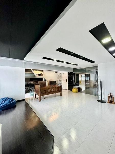 This thoughtfully designed unit features a large oval rosewood dining table under a decorative chandelier, complemented by wall-mounted floral artwork that brings life to the dining area. The bedroom, adorned with parquet wood flooring and vibrant yellow accent walls, offers a serene retreat with an integrated study desk and shelving for added convenience. With ceiling fans and wall-mounted speakers, every corner of this home is crafted for comfort and style.