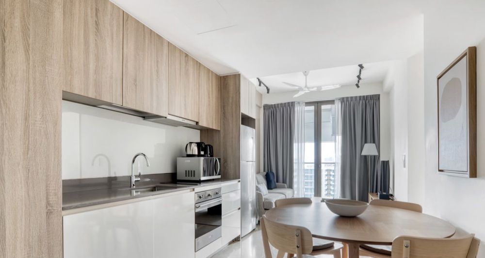 This well-maintained 2-bedroom unit boasts standout features, including a sleek open-concept kitchen with two-tone cabinetry and integrated appliances, perfect for culinary enthusiasts. The living and dining areas flow seamlessly, making it ideal for entertaining. The bedroom offers a cozy retreat with a grey accent wall, built-in sliding wardrobes, and a dedicated study desk area, ensuring both comfort and functionality. Step out onto the balcony to enjoy your morning coffee while soaking in the unblocked urban view.