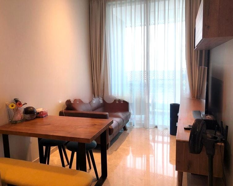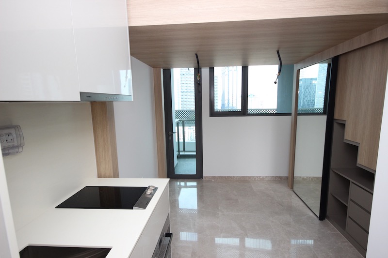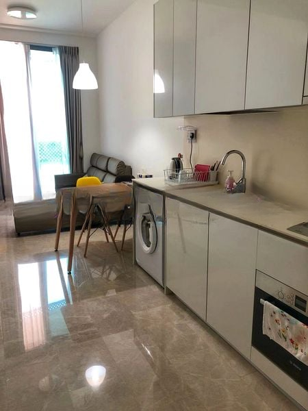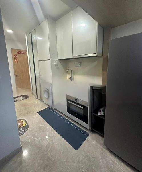 This thoughtfully designed 1-bedroom unit features a spacious living room with a built-in TV console and seamless access to a private balcony, perfect for enjoying the urban landscape. The bedroom boasts a wood-paneled ceiling and a stylish mirrored built-in wardrobe, while the bathroom is equipped with a luxurious rain shower and modern vanity. The integrated kitchen comes complete with high-quality appliances, ensuring both functionality and style.