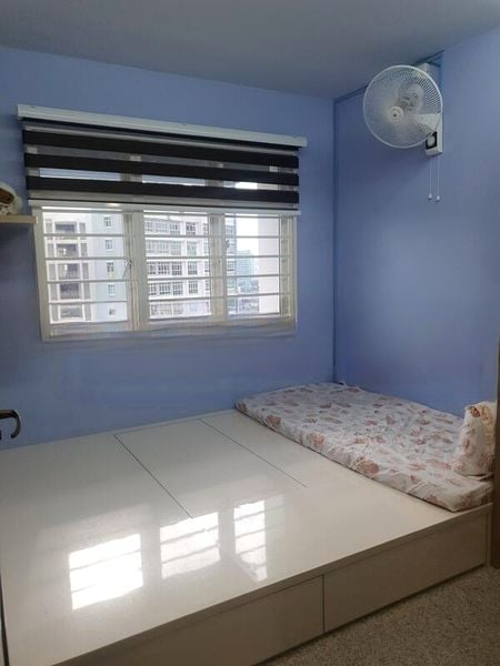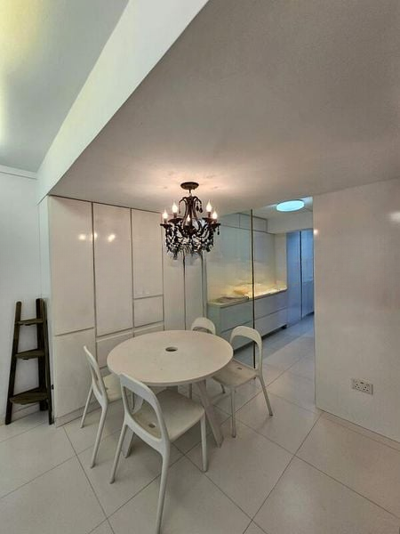Step into a world of modern elegance as you enter this beautifully renovated HDB unit at 8A Upp Boon Keng Rd. The inviting ambiance is accentuated by herringbone wood-look flooring and integrated headboard lighting, creating a warm yet contemporary feel. Natural light filters through large windows, offering views of the neighboring residential blocks and adding to the airy atmosphere.