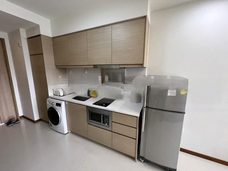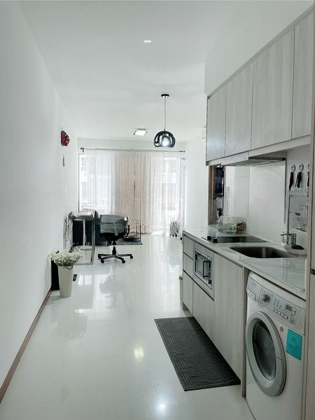 This thoughtfully designed 2-bedroom unit features a stylish island kitchen with light wood grain cabinets and integrated appliances, perfect for culinary enthusiasts. Enjoy seamless indoor-outdoor living with access to a balcony that overlooks the pool, ideal for relaxation or entertaining. Both bedrooms are equipped with built-in wardrobes and air conditioning, ensuring comfort and convenience.