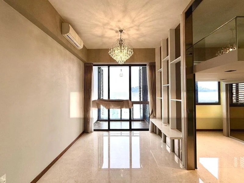 Step into a sanctuary of light and space, where abundant natural light floods through large windows, illuminating the stylish terrazzo-style flooring and high ceilings. The open-concept living and dining area invites you to unwind, while the private balcony offers serene views of the pool, greenery, and cityscape, creating a perfect backdrop for relaxation.