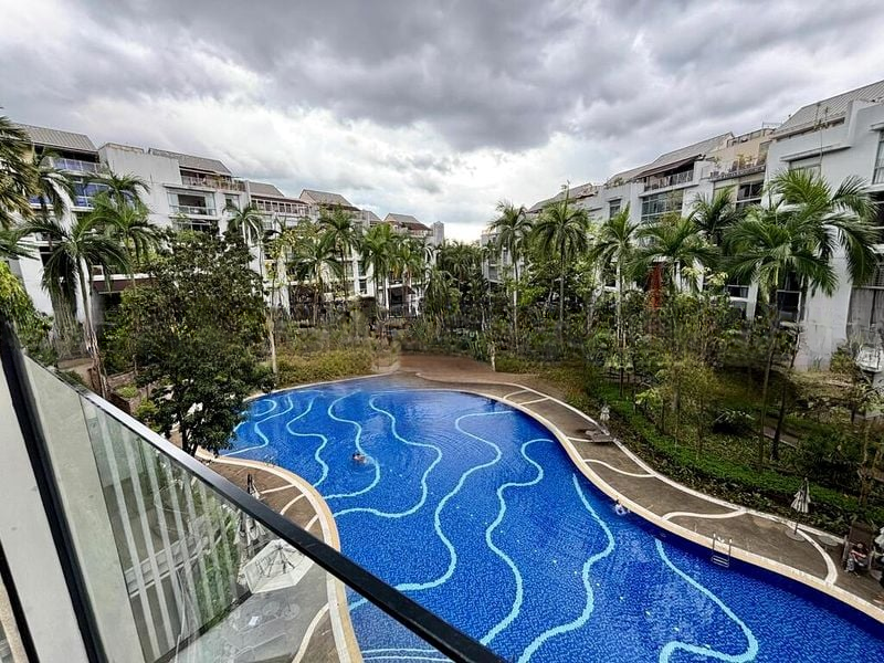 Step into a cozy and warm ambiance where natural light filters through large windows, illuminating the open-plan living and dining area. The tasteful finishes, including a marble-look bathroom and a fully-furnished setup, create an inviting atmosphere that feels like home. Enjoy serene views of the lush greenery and the sparkling pool from your spacious balcony, perfect for relaxation.