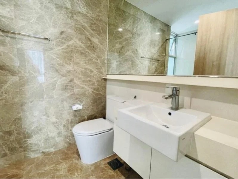 Step into a world of modern elegance as you enter this beautifully renovated 2-bedroom unit at The Lakefront Residences. The polished stone flooring reflects the natural light that filters through, creating a warm and inviting ambiance. Enjoy views of the neighboring apartment buildings from your private balcony, perfect for relaxing after a long day.