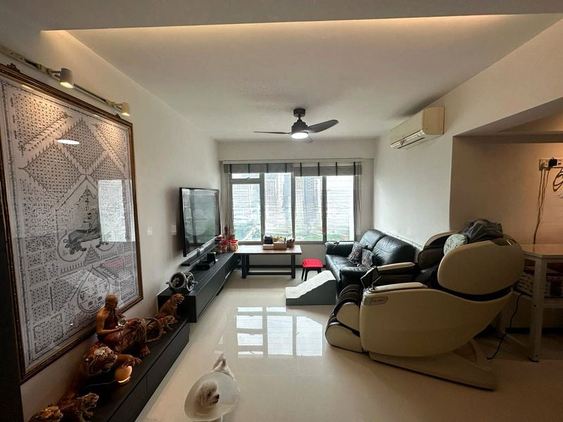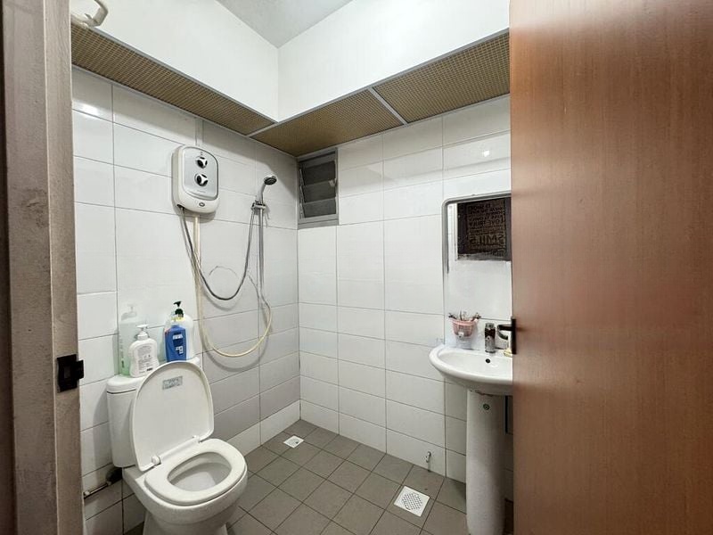 Step into this beautifully renovated 2-bedroom flat at JLN TENTERAM, where abundant natural light floods through large windows, creating a bright and airy ambiance. The inviting living room features a stylish L-shaped leather sofa against a striking blue accent wall, complemented by white tiled flooring and a ceiling fan that enhances the space's comfort.