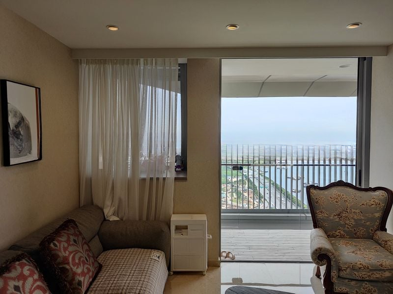 The spacious layout features a modern kitchen with integrated appliances, a breakfast counter, and a dining area adorned with contemporary pendant lighting. Each of the three bedrooms offers a serene retreat, with large windows showcasing the breathtaking views, complemented by a dedicated study area. The balcony, with its glass railing, provides an unobstructed perspective of the bustling port and ships at sea, making it the perfect spot to unwind.